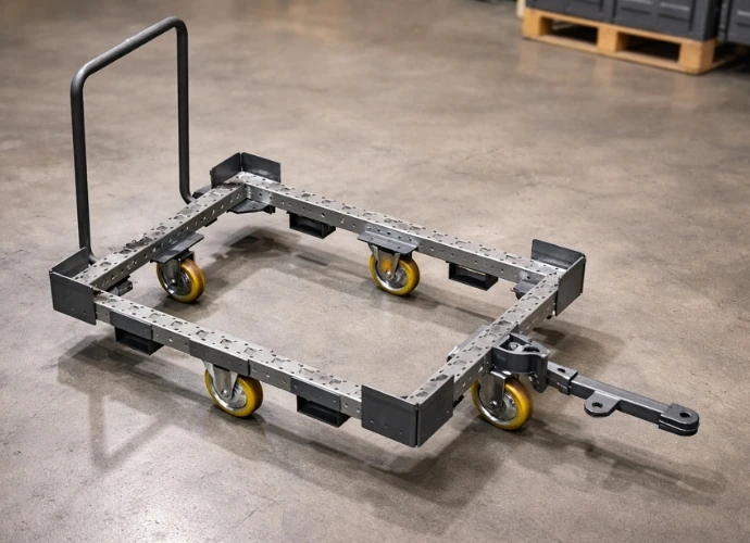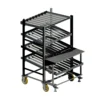 La estructura está fabricada en hierro para asegurar rigidez y estabilidad en uso continuo. El conjunto se desplaza mediante 4 ruedas de poliuretano e incluye 2 frenos de pie para inmovilización durante la operación. Permite regulación en altura tanto de las bandejas de rodillos como del banco de trabajo, facilitando la adaptación a diferentes flujos de trabajo y alturas de puesto.