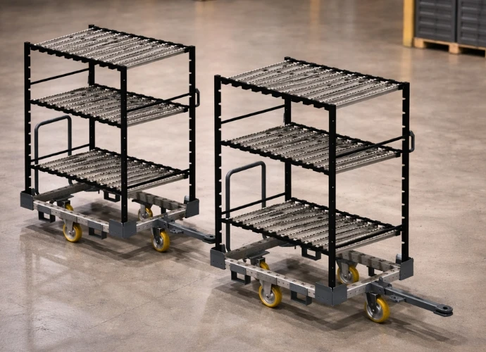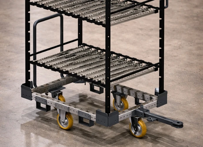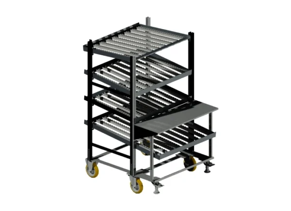 Estantería dinámica regulable con banco de trabajo integrado, desarrollada para entornos industriales y operativas Lean. Incorpora bandejas con rodillos para facilitar la transferencia y el acceso a material, junto con una superficie de apoyo para tareas de preparación, manipulación o verificación en el propio punto de uso.